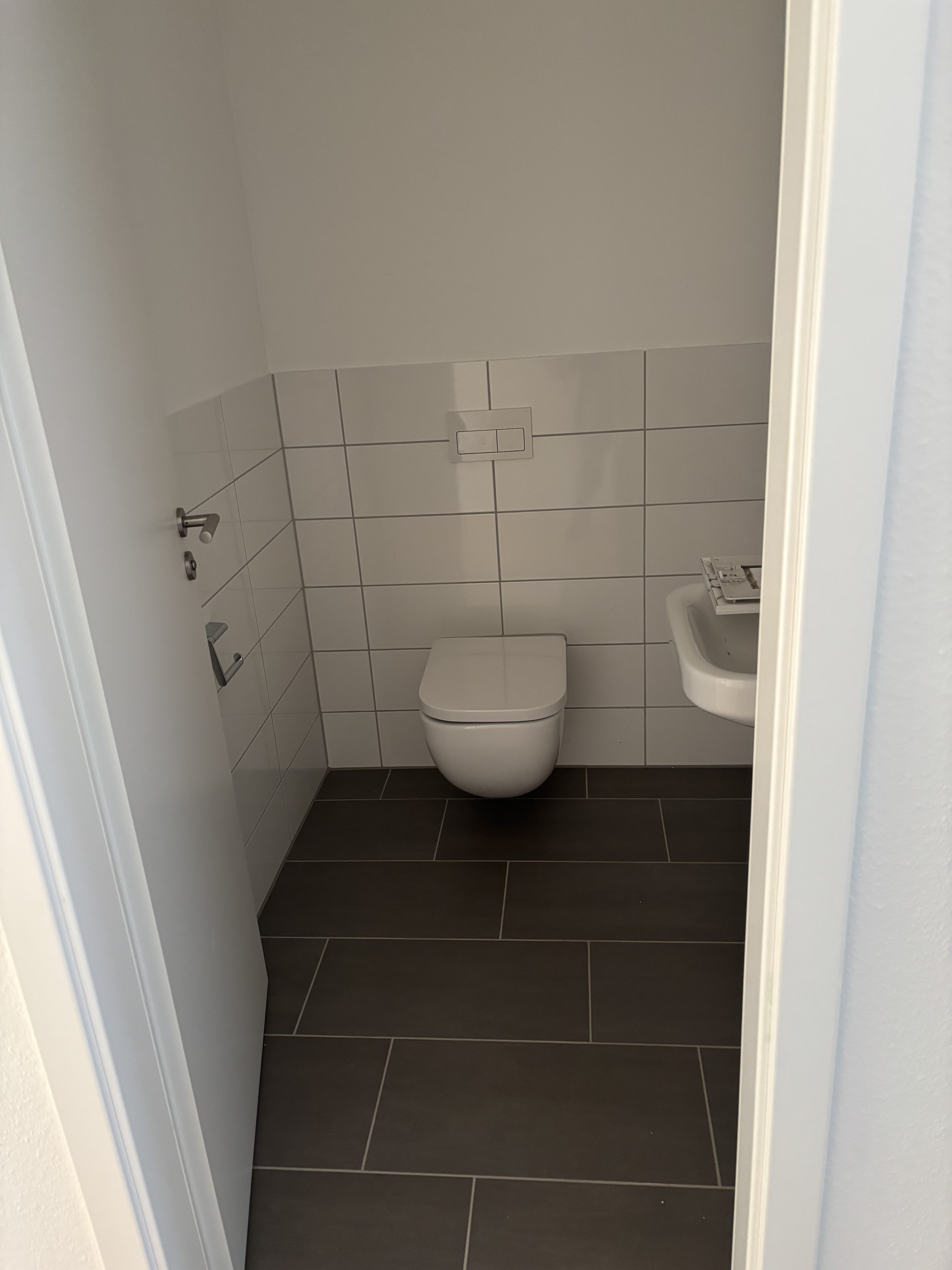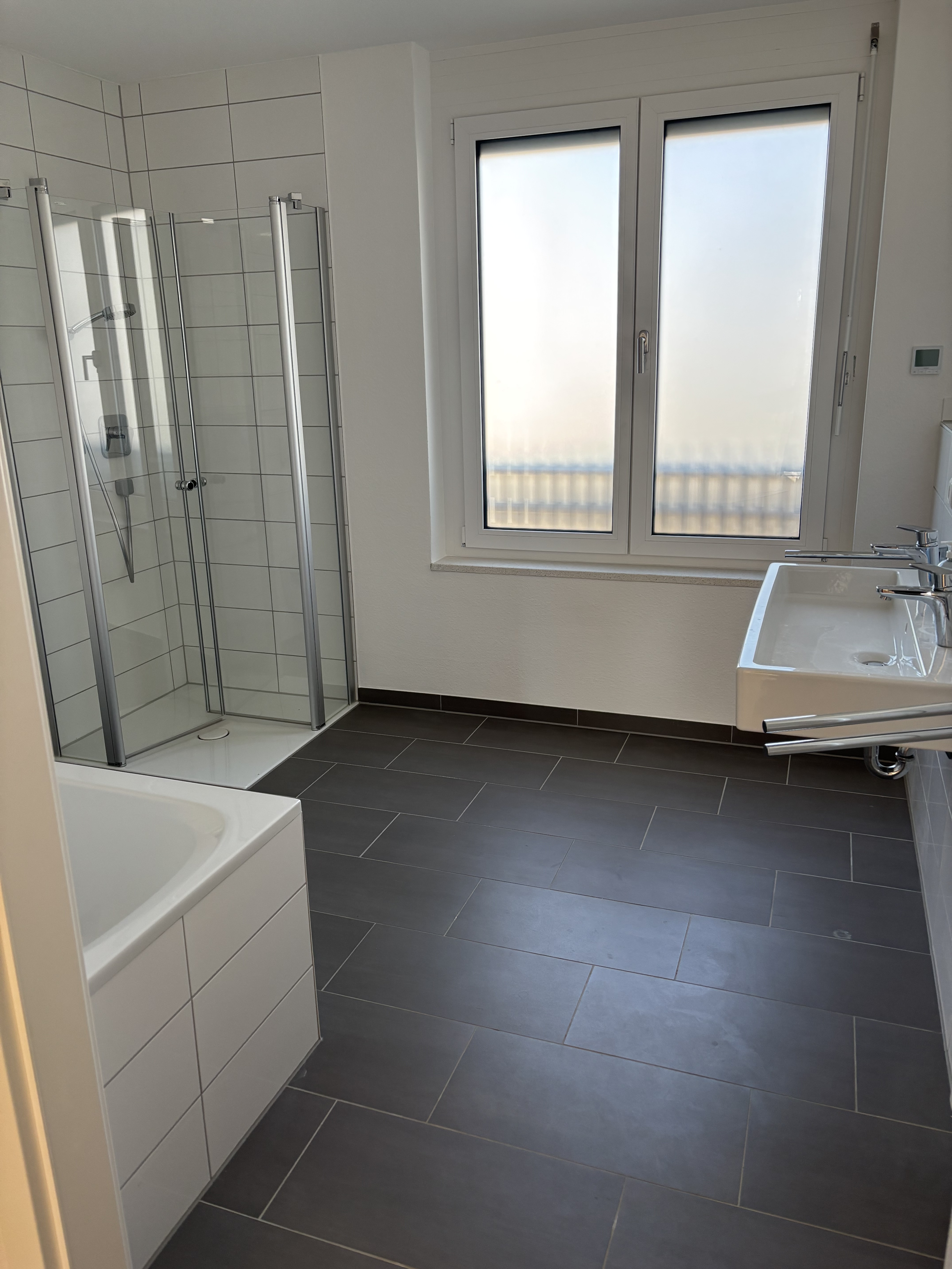 - ein Tageslichtbad mit Badewanne, Dusche, Toilette und Waschbecken