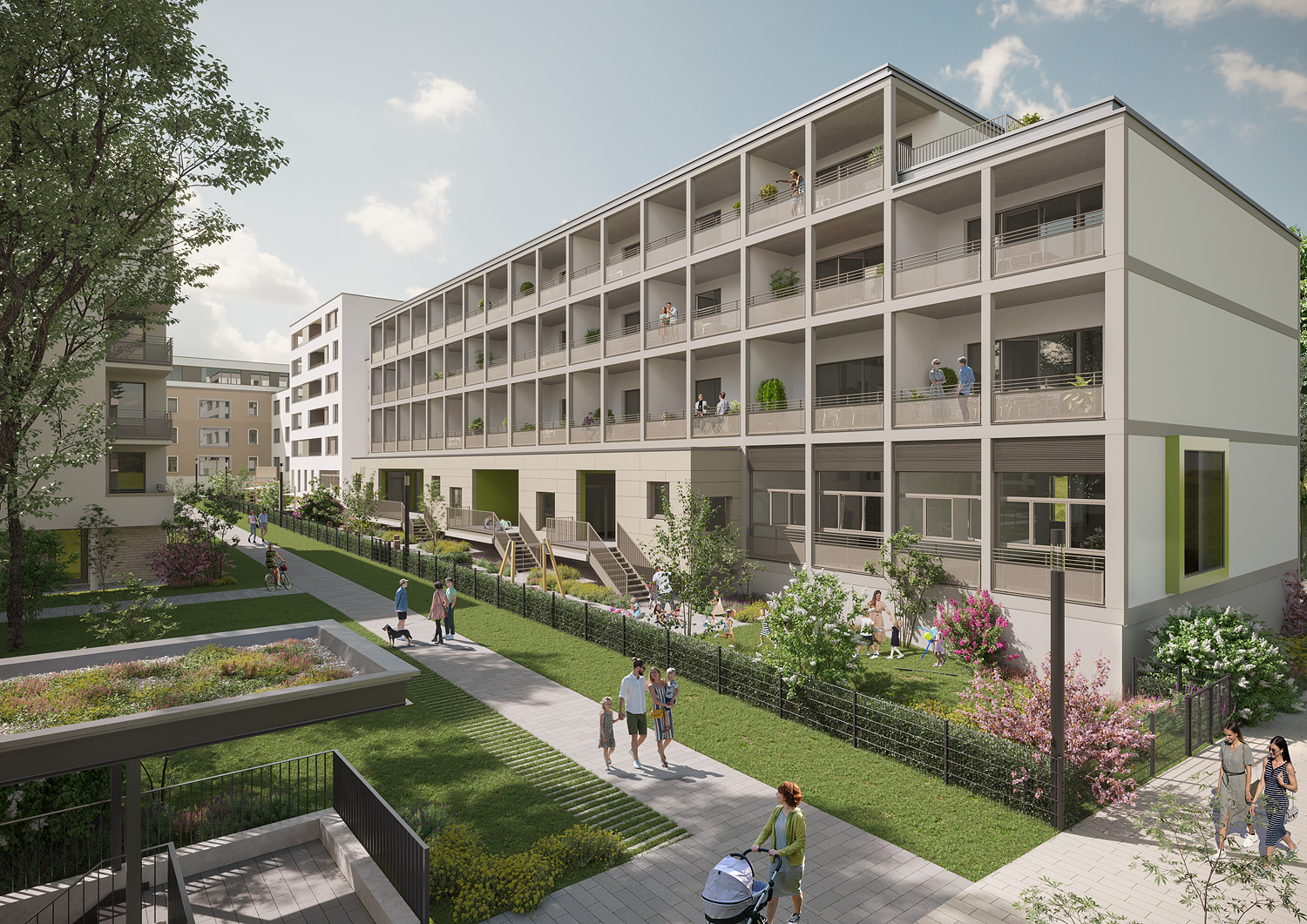 zur Innenstadt von Ludwigsburg. Auf dem Areal der ehemaligen Jägerhofkaserne ist ein attraktives Stadtquartier mit hoher Wohn- und Aufenthaltsqualität entstanden. Vielfältige Einkaufsmöglichkeiten, Freizeiteinrichtungen, Schulen und Geschäfte des täglichen Bedarfs befinden sich in unmittelbarer Umgebung. Im autofreien Quartier gibt es eine KITA sowie Spielbereiche und viele Grünflächen.